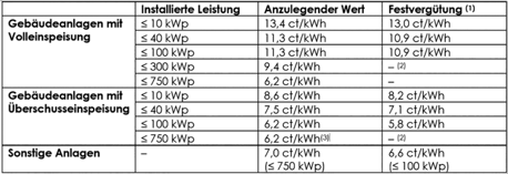 Eine 15 kWp-Anlage mit Volleinspeisung erhält für die ersten 10 kWp 13,0 Cent, für die verbleibenden 5 kWp 10,9 Cent pro Kilowattstunde.