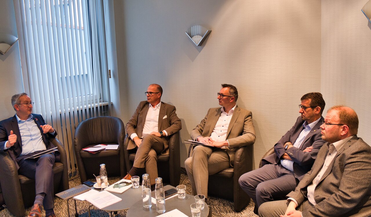 Vorsitzender Stefan Menrath übergab Schwarz gleich zu Beginn die Jubiläumsfestschrift 75 Jahre Fachverband. Gemeinsam mit dem Stellvertretenden Vorsitzenden Bernd Simon, Vorstandsmitglied Rainer Häfele, Hauptgeschäftsführer Wolfgang Becker und Referatsleiter Technik Jörg Knapp schilderte Menrath die aktuelle Situation des SHK-Handwerks mit einer schwieriger werdenden Marktlage, großer Verunsicherung der Verbraucher aufgrund der Entwicklung bei GEG und Förderung. „Wir brauchen dringend eine Beruhigung der Situation, Vertrauen in die beschlossenen Gesetze und in die zukünftigen Technologien wie die Wärmepumpe“, sagte Becker. Im Bereich der aktuellen Wärmeplanung stellte der Fachverband die neue Seite ww.waermeplanung-bw.de vor, informierte über die Entwicklung von Wärmeplanungen und Wärmenetzen im Land und wies aber darauf hin, die Erwartungen nicht zu hochzuhängen. „Der Großteil der Gebäude wird auch 2040 noch individuell beheizt“, beschrieb Becker die zu erwartende Entwicklung. Als Teil des Bündnisses „Impulse für den Wohnungsbau“ machte sich der Fachverband auch stark für eine Senkung der Grunderwerbssteuer.